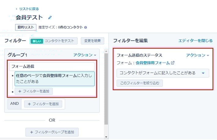 次に[フィルター]にフォームを送信を設定して、先ほど作成した会員登録用のフォームを設定します。