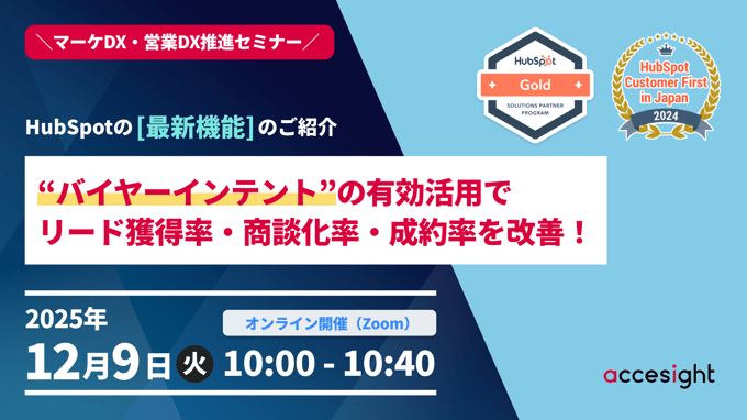 \HubSpotの【最新機能】のご紹介/ リード獲得をもっと効率化したい。リード獲得してからなかなか商談まで進まない。商談中ではあるがなかなか成約まで進まない。といったビジネス課題を解決するHubSpotの「バイヤーインテント」の機能とその活用方法についてご紹介します。